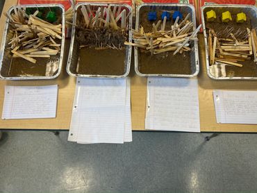 Erosion STEM Activity: During our Weathering, Erosion, and Deposition science unit, fourth graders were challenged to design structures that would protect the shoreline from water erosion. The concept of erosion, specifically coastal erosion was reviewed from the lesson prior. Students then watched a news clip reporting on the threat of coastal erosion for many homes on the north shore of Long Island. With wide eyes, fourth graders proposed various solutions to prevent erosion along the coast, sharing ideas such as building walls to stop the waves or planting trees and shrubs along the shoreline to keep the sand and soil in place with roots. The students were shown various traditional structures that have been utilized to minimize erosion. Four teams were assigned and students built "beaches" using water and sand. Students were directed to mimic waves with their hands in the water and shared observations about what changes occurred as the waves hit their "beaches," most noting that the sand was moving from the "beach" into the water and the "beaches" became smaller. Students were given the challenge to create their own erosion-preventing structures to protect their beach houses using only popsicle sticks and toothpicks. Each team trialed different structures, testing them out with waves. While some teams avoided the toothpicks altogether opting for popsicle sticks, other teams designed structures weaving popsicle sticks and toothpicks together to steady their walls. Each team used trial and error to figure out what worked and what needed adjustment, eventually designing structures that slowed the flow of water near the beach houses. Students that viewed the concept of erosion as some foreign concept that did not impact their lives during previous lessons were shocked to learn about the connection to homes in nearby communities and were excited to think of ways to help.